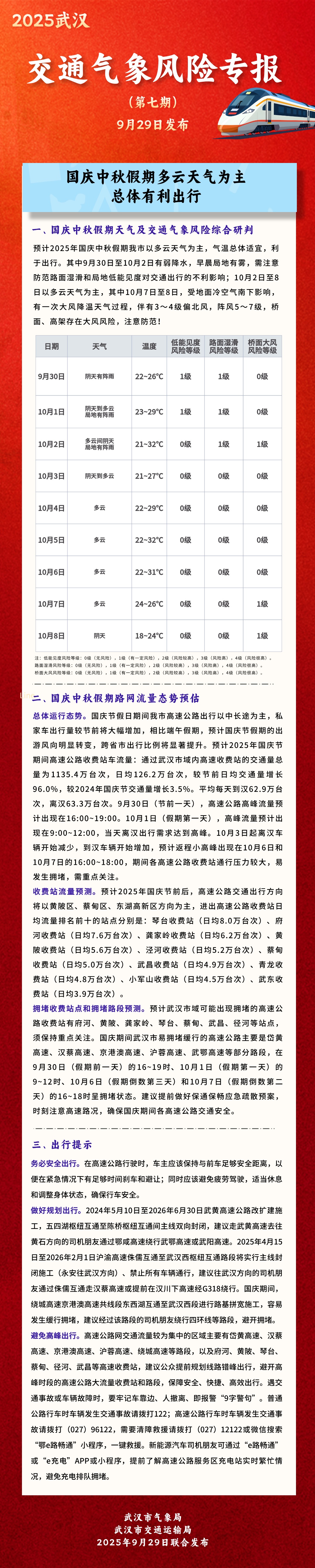 Hubei Daily(记者Tang Weiwei,通讯员Chen Shengchao)于9月29日,Wuhan市政气象局和Wuhan市政交通局共同发布了“气象风险特别报告”。特别报纸表明,在国庆节和中期节日假期中,武汉市主要是多云,这通常很愉快。其中,从9月30日至10月2日,雨季将有一个微弱的雨季,早晨将有雾。请注意防止湿滑的道路表面的不利影响和交通知名度较低。从10月2日至8日,多云的天气将是主要的。从10月7日至8日,由于地面上的冷空气,将会有一个强风和天气冷却过程,再加上3至4级的北风,阵风的阵风为5至7级。请注意避免!预计武汉城将主要在下周多云,在某些地方会洗个澡。其中,从9月29日至10月2日,雨季将有一个微弱的雨季;从-2到3,从第五到第六,弱的冷空气到地面将向南移动,北风将增加,温度将略有降低。具体的预测如下:9月29日:阴云密布,包括当地阵雨,北风2至3,温度22至26°; 9月30日:多云和多雨的北风变为东风2至3,温度为22至26℃; 10月1日:多云,有当地阵雨,向南2至3,阵风4至5,温度23至29℃; 10月2日:多云和多云,当地的淋浴时,南风转向北风,阵风为4至5,温度为21至32℃; 10月3日:多云,北风3,温度为21至27℃; 10月4日:多云,北风2至3,温度为22至29℃; 10月5日:多云,北风级3,温度为22至32℃; oCTOBER 6:多云,北风级3至4,温度为22至31℃。